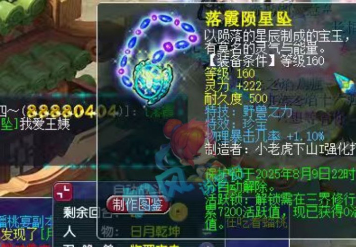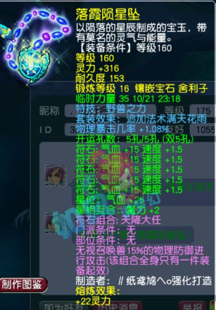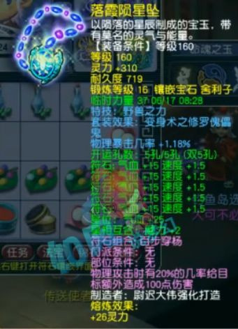 新出一条160野兽之力项链,附加物暴几率1.1%。如今的175PK版本当中,野兽是物理系的必备特技,九黎城门派更是偏爱物暴几率,这条项链应该会非常吃香。